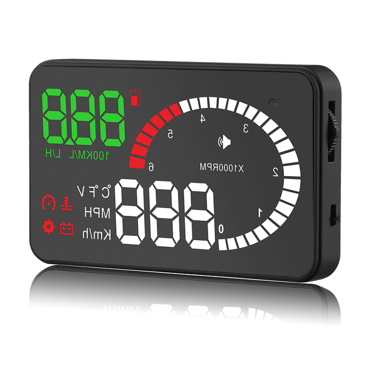 Цифровое многофункциональное устройство для отображения значения скорости и других параметров автомобиля на ветровое стекло возможно устанавливать на все автомобили, оборудованные диагностическим разъемом стандарта OBD II. Портативный проектор устанавливается на панели и при помощи ярких светодиодов проецирует значения скорости, оборотов двигателя, и расхода топлива на ветровое стекло. Поскольку в автомобилях применяется слоеное стекло – триплекс, то изображение может двоиться. Чтобы сделать изображение более четким применяется специальная отражающая пленка, которая наклеивается на стекло в область дисплея. Встроенный в проектор датчик освещенности автоматически регулирует яркость светодиодов для комфортного восприятия в любое время суток. Для всех режимов устанавливаются предельные значения по выбору владельца при достижении которых включается звуковой сигнал. Питание устройства осуществляются от бортовой сети автомобиля через сервисный разъем. Все установки сохраняются в энергонезависимой памяти устройства.